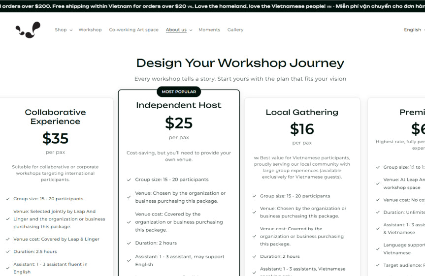 - Added a new page for workshop collaborations with third parties or organizations. Now, partners can easily connect and view Leap And Linger’s workshop pricing!